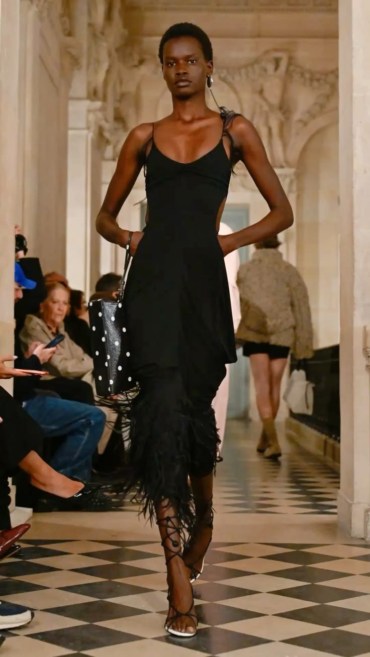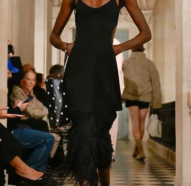 Tastekeeper Silhouette: "Well, Look 17 (feathered set) feels out of place here, as if the House forgets its own DNA. Those feathers have to go. Look 3 (beige and black skirt set) as much as I love the top, the skirt looks unfinished, look at the hem, absolutely not!"
